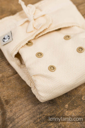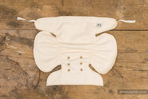 Før Bruk: Før den første vasken anbefales det å bløtlegge bleien over natten i varmt vann med oppvask såpe for å fremskynde prosessen med å skylle ut oljene i bomullen. Bomull er en naturlig fiber som trenger 5 til 9 vaskinger for å bli fullstendig absorberende. Bleien kan brukes etter den første vasken, men husk å skifte den oftere i begynnelsen.