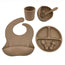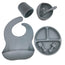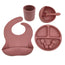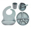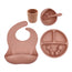 Dette er en pakke med mange deler, for den første tiden med selvspising: baby smekke, skål og inndelt tallerken med sugekopp, kopp og babybestikk.